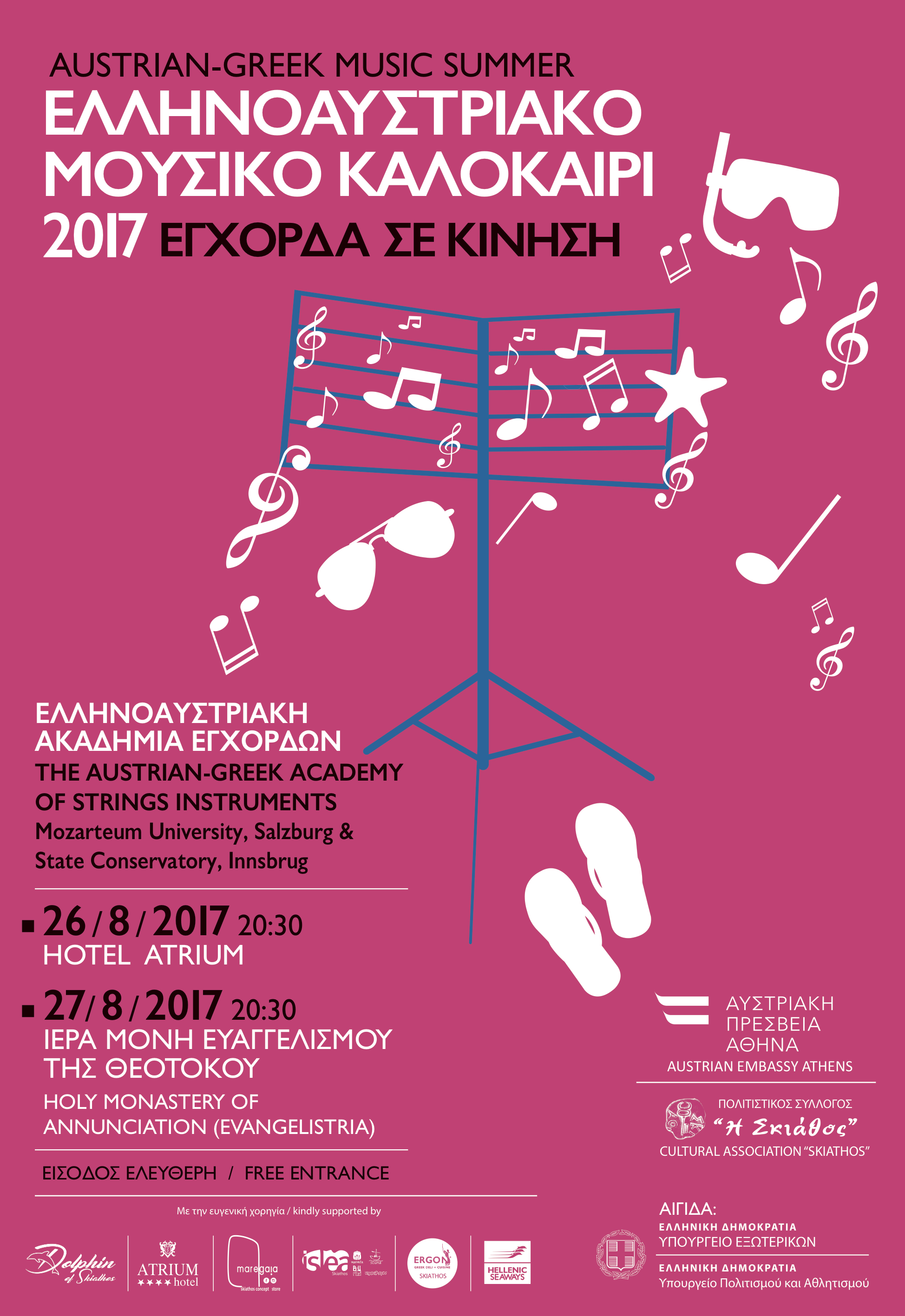 Ο Πολιτιστικός Σύλλογος «Η Σκιάθος», ευχαριστεί θερμά την Πρεσβεία της Αυστρίας στην Αθήνα και ιδιαίτερα την Πρέσβη Andrea Ikić-Böhm όπως και τον Επιτετραμένο της Πρεσβείας Alexander Wojda, για την τιμητική συνεργασία, μέσα από την οποία δώθηκε η δυνατότητα να παρουσιάσουμε στη Σκιάθο, διεθνούς εμβέλειας πολιτιστικές εκδηλώσεις, την κυρία Fleur Ποταμιάνου και τον κύριο Ανδρέα Ποταμιάνο για την πολύτιμη συμβολή τους, την υπεύθυνη του πολιτιστικού προγράμματος της Πρεσβείας κυρία Χαρά Μαμάτα, τον Ηγούμενο της Ιεράς Μονής Ευαγγελισμού της Θεοτόκου. Τις συναυλίες υποστήριξαν με την ευγενική τους χορηγία, το ξενοδοχείο Atrium/Ηλέκτρα Χατζημιχάλη, το τουριστικό γραφείο Dolphin of Skiathos/Αλέξανδρος Ευσταθίου, το Hospitality Group islea/Δημήτρης Κολιάκος, το Mare Gaia concept store/Κατερίνα Μιχαήλ, το εστιατόριο ERGON /Δέσποινα Μαρκάκη, και η εταιτρεία Hellenic Seaways.