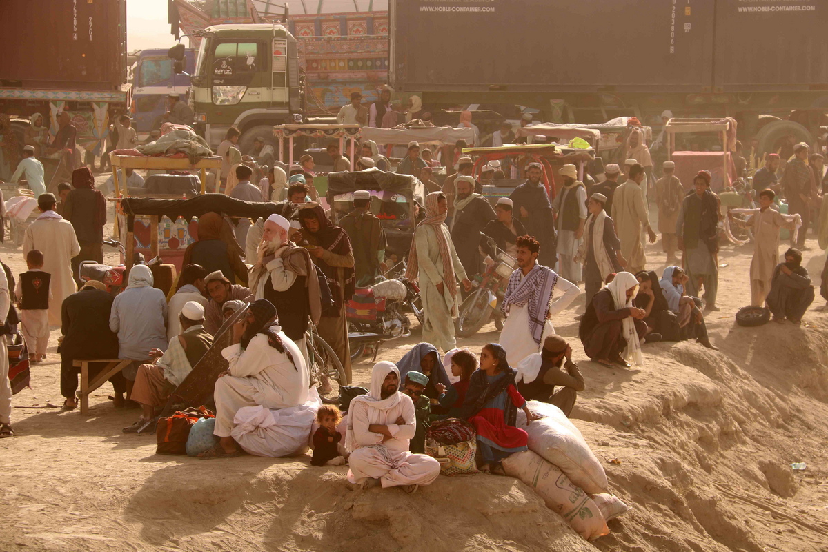 epa09507295 People stranded at the Pakistani-Afghan border wait for its reopening after it was closed by the Taliban who have taken over the control of the Afghan side of the border at Chaman, Pakistan, 05 October 2021.Taliban authorities have closed their side of the Afghan border for an indefinite period demanding the Pakistani authorities for making the process easier for Afghans who wants to cross into Pakistan through Chaman border. EPA/AKHTER GULFAM