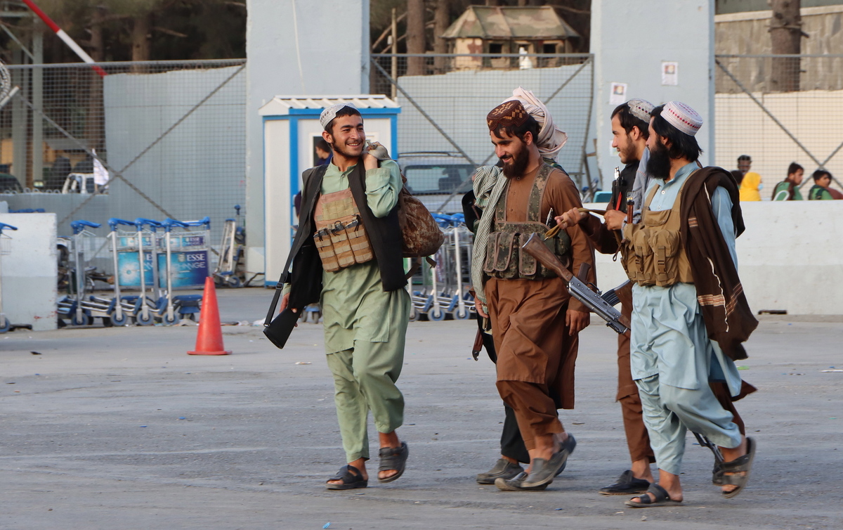 epa09433954 Taliban patrols outside the Hamid Karzai International Airport in Kabul, Afghanistan, 28 August 2021. The Taliban on 28 August, asked Afghan citizens to return, within a week, all the guns, ammunition, vehicles, and other government properties in their possession. He warned that if people fail to hand over the government properties, the violators would 'be prosecuted and dealt with legally, if government belongings are found' in their possession. The call for voluntary surrender of weapons and other government properties comes just as the Taliban are expected to announce their new government in Afghanistan before the 31 Aug August withdrawal deadline for international troops. EPA/STRINGER