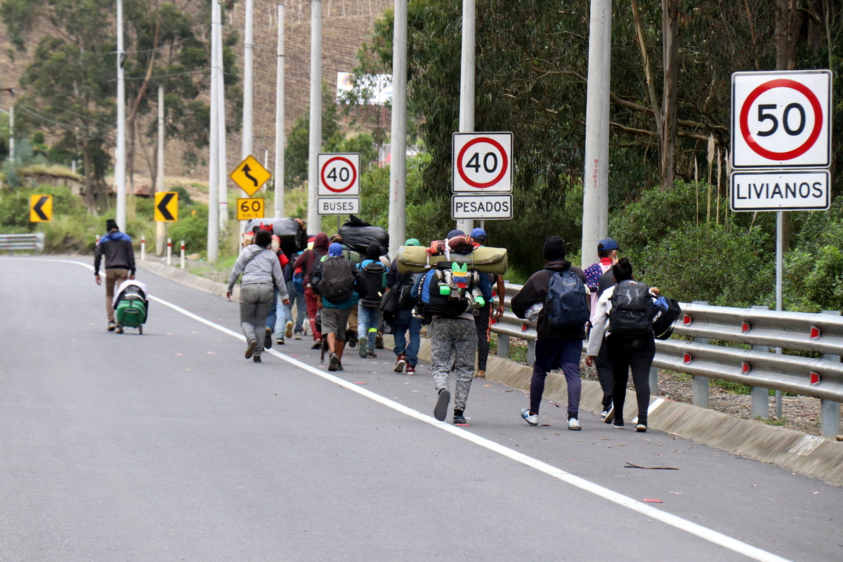 epa08430687 A group of Venezuelan migrants walking along a highway near the Colombian border, shortly before entering the forest to cross the Carchi River through one of the illegal passages in the Rumichaca Complex sector y el Brinco, a few meters from the international bridge in Ecuador, 13 May 2020 (issued 18 May 2020). EPA/Xavier Montalvo