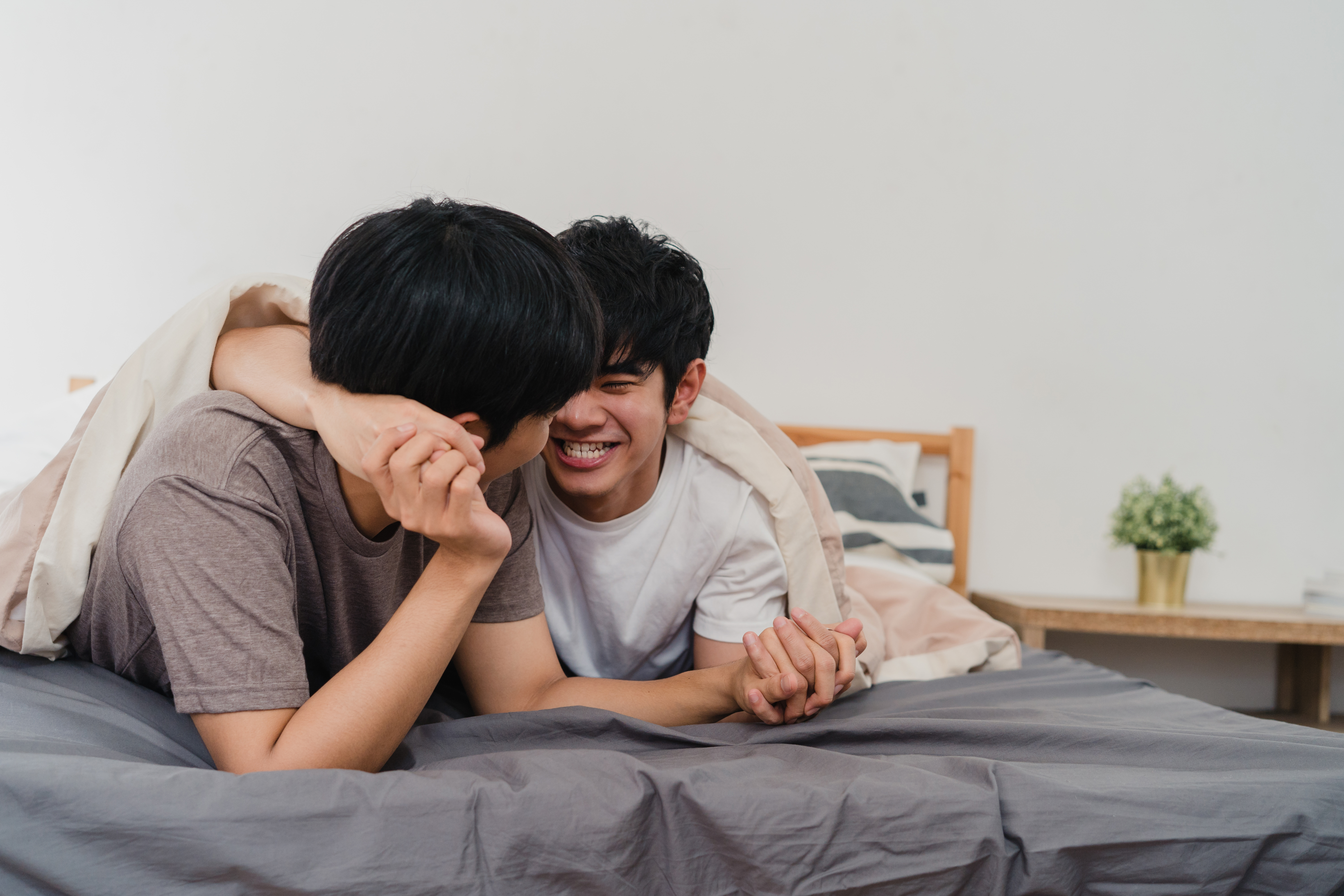Handsome Asian gay couple talking on bed at home. Young Asian LGBTQ+ guy happy relax rest together spend romantic time after wake up in bedroom at modern house in the morning concept.