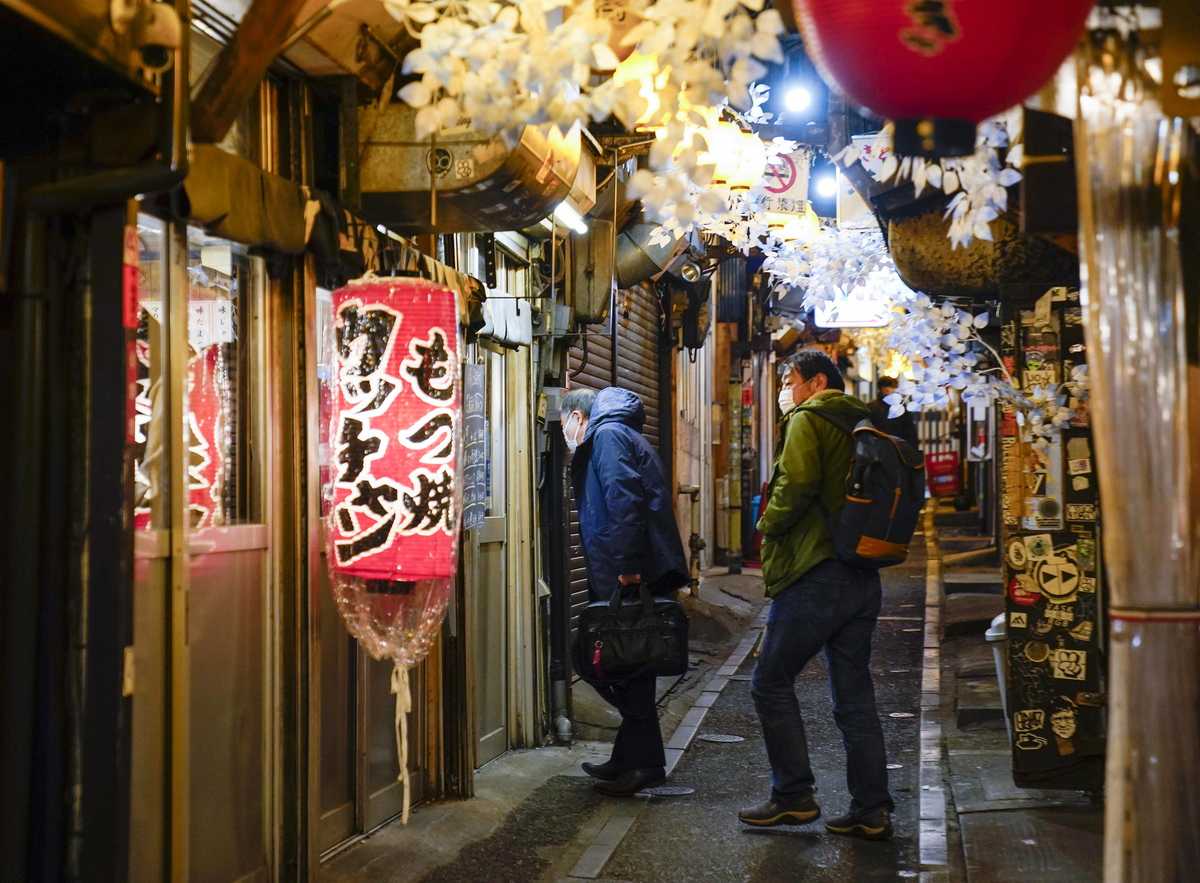 epa08935038 Visitors look for a place for drinks at a tiny Shinjuku drinking street in Tokyo, Japan, 13 January 2021. Japanese Prime Minister Suga announced on the day that Japan has expanded a state of emergency to seven more prefectures amid a resurgence of the coronavirus disease (COVID-19) pandemic across the country. Along with the Tokyo metropolitan area, declared in a state of emergency last week, a total of 11 prefectures will remain under the strict measure until 07 February, covering around 70 millions of the 126 millions of the Japanese population. EPA/KIMIMASA MAYAMA