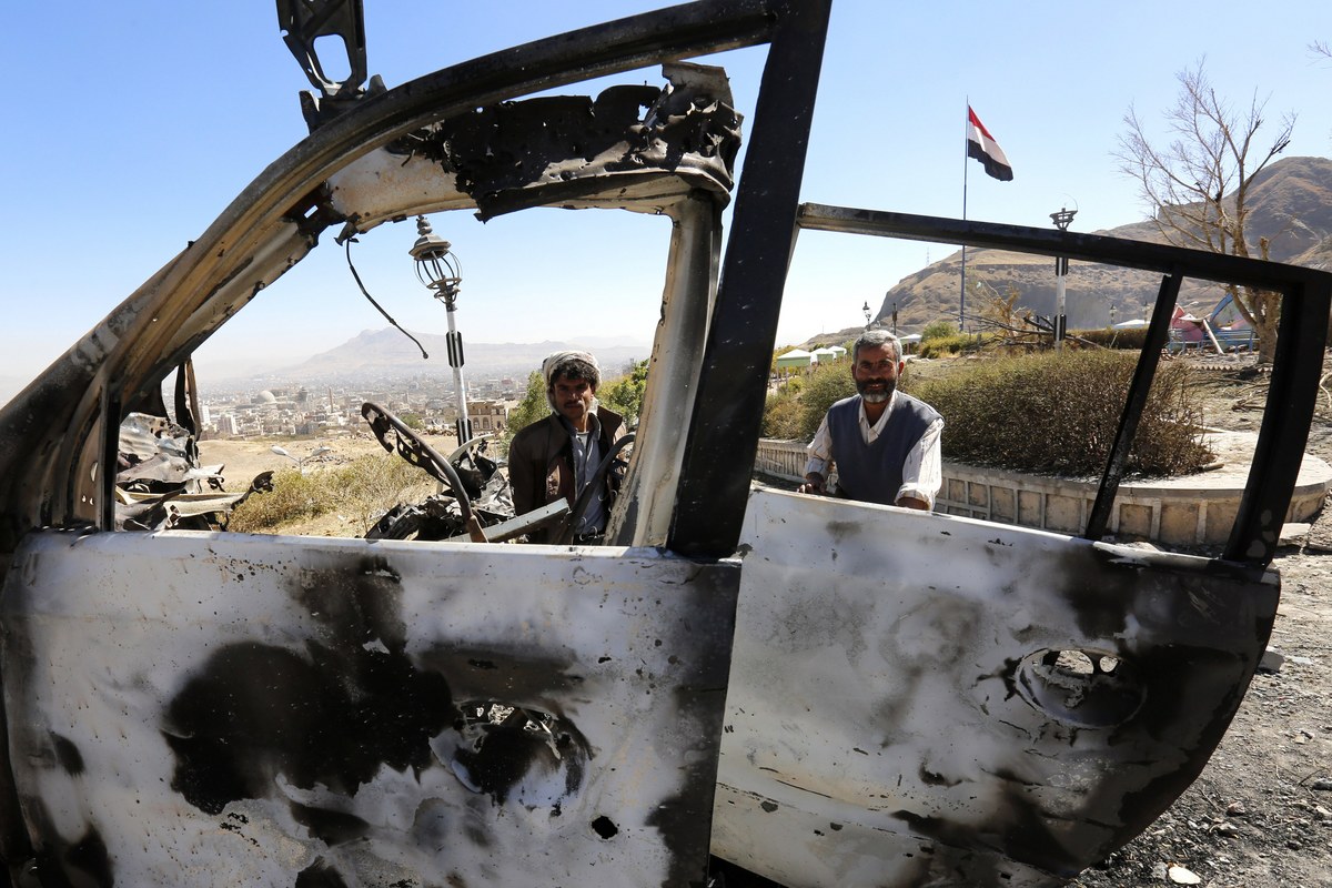 epa06406310 Yemenis inspect the site of alleged Saudi-led airstrikes at a memorial of Egyptian soldiers, in Sana'a, Yemen, 26 December 2017. According to reports, at least 48 civilians, including 11 children, have been killed and 55 others wounded in airstrikes allegedly carried out by the Saudi-led military coalition across Yemen. EPA/YAHYA ARHAB