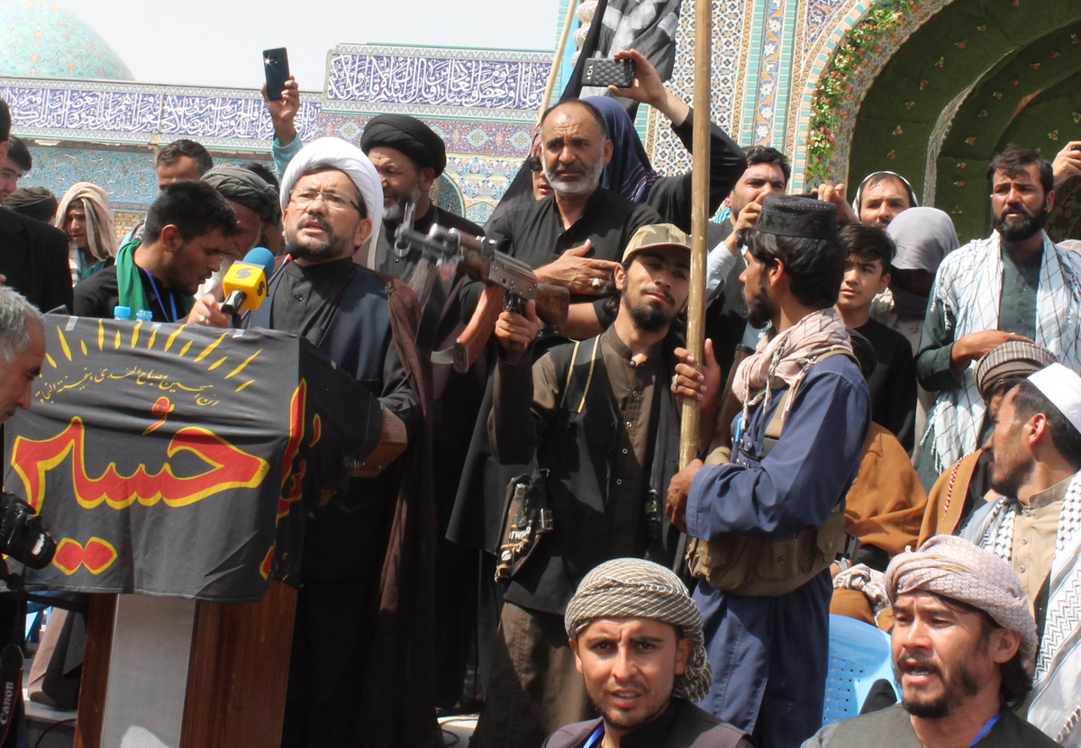 epa09420043 A Taliban holds a rifle to the back of the speaker's head as he stands guard as Shi'ite Muslims attend the mourning procession during Ashura, in Mazar-e-Sharif, Afghanistan, 19 August 2021. Shiite Muslims are observing the holy month of Muharram, the climax of which is the Ashura festival that commemorates the martyrdom of Imam Hussein, a grandson of the Prophet Mohammed, in the Iraqi city of Karbala in the seventh century. EPA/STRINGER Recropped version of epa09420032