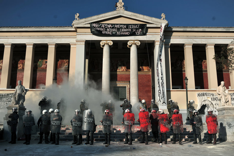 Επεισόδια σημειώθηκαν περίπου στις 6:30 το απόγευμα της Πέμπτης στην οδό Πανεπιστημίου, όταν οι δυνάμεις των ΜΑΤ που έχουν περικυκλώσει το κτίριο της Πρυτανείας του Πανεπιστημίου Αθηνών απώθησαν με χημικά και χειροβομβίδες κρότου-λάμψης ομάδα αντιεξουσιαστών που επιχείρησαν να σπάσουν τον κλοιό. Στο σημείο συγκεντρώθηκαν διαδηλωτές κατά των μεταλλείων στις Σκουριές. Μεταξύ των συγκεντρωμένων, παρεισέφρησαν και αντιεξουσιαστές, που όπως φαίνεται στις παρακάτω εικόνες επιτέθηκαν σε διμοιρία των ΜΑΤ, με κλωτσιές και πυροσβεστήρες. Η αστυνομία απομάκρυνε από το σημείο των επεισοδίων τους 700 πολίτες που είχαν συγκεντρωθεί στα Προπύλαια. Η πορεία τους, που διοργανώθηκε από την Επιτροπή Αλληλεγγύης στη Χαλκιδική (Αττικής), ξεκίνησε λίγο αργότερα, κατευθύνθηκε προς το Σύνταγμα και από εκεί επέστρεψε στην Ομόνοια όπου και διαλύθηκε. Ένταση, όμως, υπάρχει ακόμα σε δρόμους των Εξαρχείων.