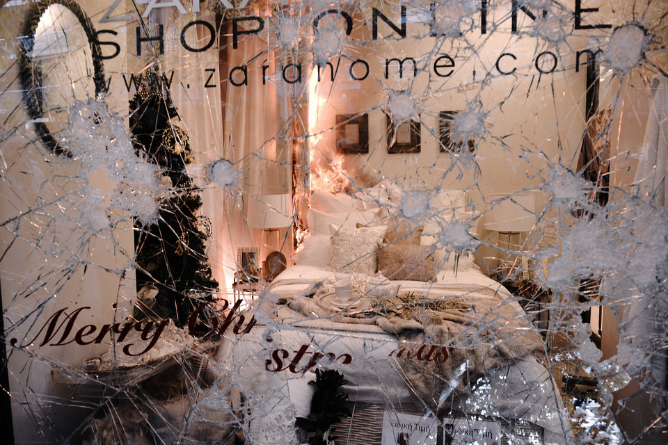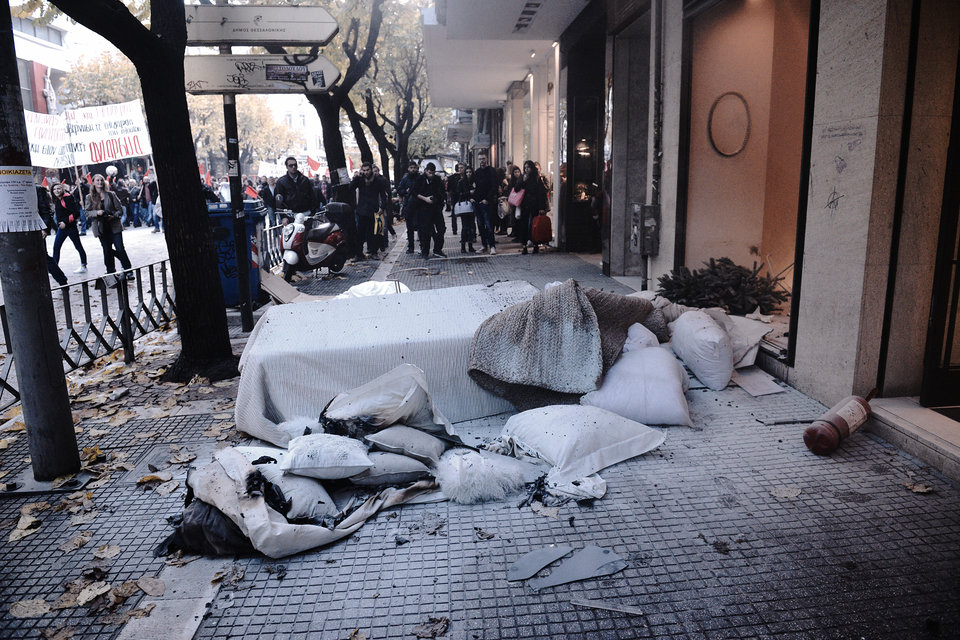 Κατά τη διάρκεια των επεισοδιών προκλήθηκαν υλικές ζημιές σε καταστήματα και τράπεζες, ενώ γνωστό πολυκατάστημα παραδόθηκε στις φλόγες. Λίγο μετά τις 15:30 διαδηλωτές έσπασαν την πόρτα του Εργατικού Κέντρου, το οποίο αυτή τη στιγμή τελεί υπό κατάληψη.Παράλληλα, άγριες συγκρούσεις μεταξύ ΜΑΤ και διαδηλωτών σημειώθηκαν έξω από το Αμερικανικό Προξενείο. Η πορεία στη συνέχεια χωρίστηκε στα δύο, ωστόσο αυτή την ώρα και τα δύο τμήματά της βρίσκονται ενωμένα στην οδό Εγνατία, στο ύψος της πλατείας Αριστοτέλους, ενώ ισχυρές αστυνομικές δυνάμεις παρακολουθούν τις κινήσεις διαδηλωτών και κουκουλοφόρων. Σύμφωνα με πληροφορίες η αστυνομία έχει ήδη προχωρήσει σε προσαγωγές, ενώ κατά άλλες πληροφορίες έχουν γίνει και συλλήψεις. Πηγή: iefimerida