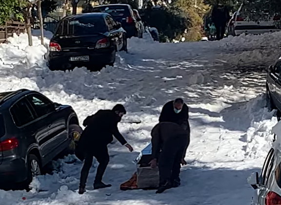 Συγκλονιστικές είναι οι εικόνες που καταγράφηκαν σε χιονισμένους δρόμους του Ζωγράφου στη διάρκεια της επέλασης της κακοκαιρίας Ελπίδα. Τρεις άντρες έσερναν ένα φέρετρο πάνω στον πάγο στο κέντρο της πρωτεύουσας για να το μετακινήσουν εξαιτίας των αποκλεισμένων δρόμων.