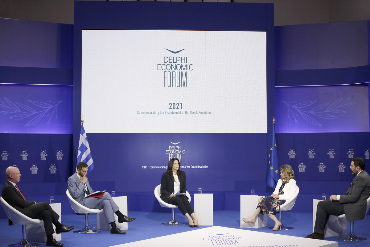 Ο Elenos Karaindros (Δ) (General Manager - Strategy, Mergers & Acquisitions, MYTILINEOS, Greece), ο Δημήτρης Κυπαρίσσης (Α) (CEO, Optima Bank, Greece), η Βασιλική Λαζαράκου (2η Δ) (Chair, Hellenic Capital Market Commission) και ο Γιώργος Τρυφινόπουλος (2ος Α) (Head of Strategy, Hellenic Financial Stability Fund), μιλάνε σε πάνελ την 3η ημέρα του 6oυ Οικονομικού Φόρουμ των Δελφών, στο Μέγαρο του Ζαππείου, Τετάρτη 12 Μαΐου 2021. Στο φετινό Φόρουμ συμμετέχουν 800 υψηλοί καλεσμένοι ομιλητές από 42 χώρες. Το φετινό πρόγραμμα έχει μεγάλη διάρκεια επειδή περιλαμβάνει αρκετές και σημαντικές ενότητες αφιερωμένες στην Ελληνική Επανάσταση του 1821. ΑΠΕ-ΜΠΕ/ΑΠΕ-ΜΠΕ/ΒΑΪΟΣ ΧΑΣΙΑΛΗΣ