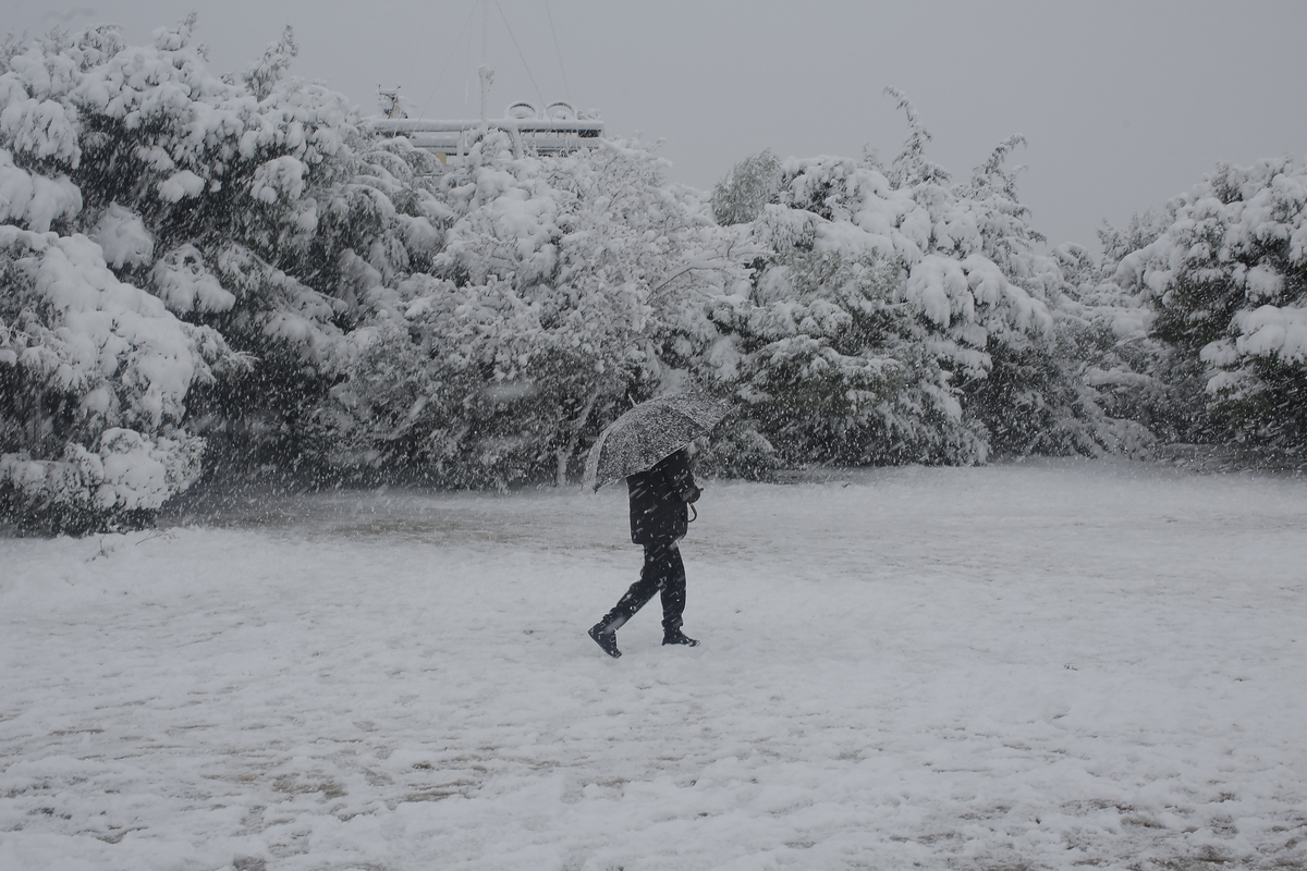 Αθηναίος περπατά εν μέσω χιονόπτωσης στο λόφο του Φιλοπάππου, Αθήνα, Τρίτη 16 Φεβρουαρίου 2021. Συνεχίζεται η σφοδρή κακοκαιρία με έντονα φαινόμενα και πυκνές χιονοπτώσεις που έχουν κλείσει πολλούς δρόμους και έχουν δημιουργήσει έντονα προβλήματα στις μετακινήσεις. ΑΠΕ-ΜΠΕ/ΑΠΕ-ΜΠΕ/ΚΩΣΤΑΣ ΤΣΙΡΩΝΗΣ