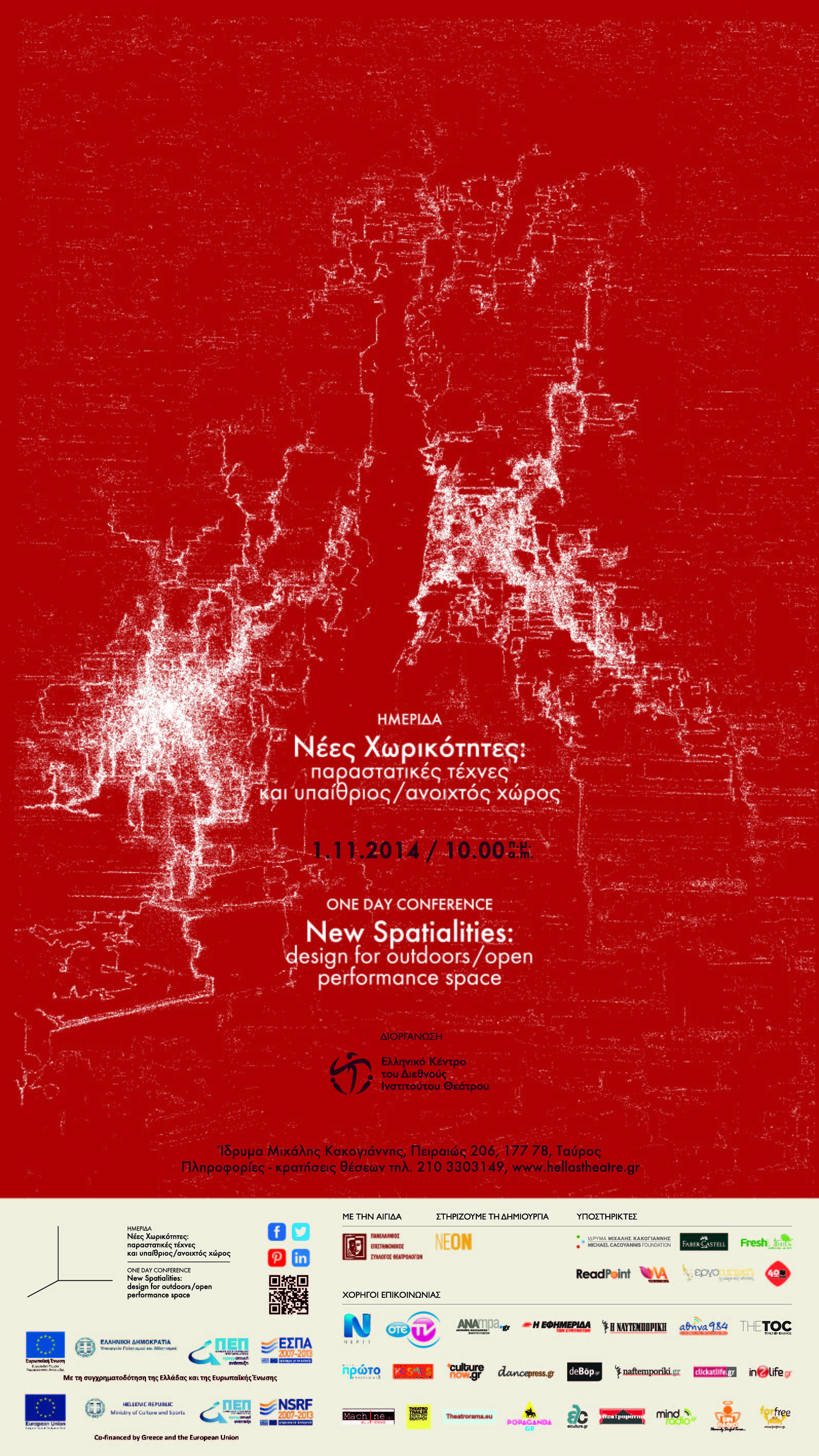 Ημερίδα με τίτλο «Νέες Χωρητικότητες:Παραστατικές Τέχνες και υπαίθριος/ανοιχτός χώρος» διοργανώνει το Ελληνικό Κέντρο του Διεθνούς Ινστιτούτου Θεάτρου την 1η Νοεμβρίου στο Ίδρυμα Μιχάλης Κακογιάννης. Στα πλαίσια της ημερίδας θα παρουσιαστούν projects παραστατικών τεχνών που πραγματοποιήθηκαν κυρίως στην Ελλάδα τα τελευταία τέσσερα χρόνια και τα οποία θα αποτελέσουν μέρος της Ελληνικής Εθνικής Συμμετοχής στη Διεθνή Έκθεση Θεατρικής Σκηνογραφίας και Αρχιτεκτονικής Prague Quadrennial 2015.
