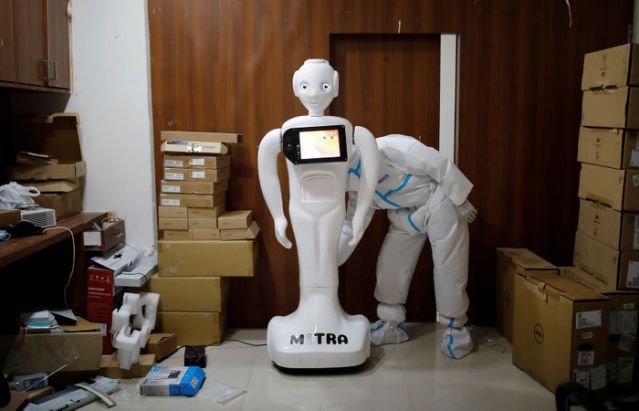 Νοσοκομείο στην Ινδία έχει επιστρατεύσει ένα ρομπότ για να μετακινείται μεταξύ των θαλάμων βοηθώντας τους ασθενείς να επικοινωνήσουν με φίλους και συγγενείς.