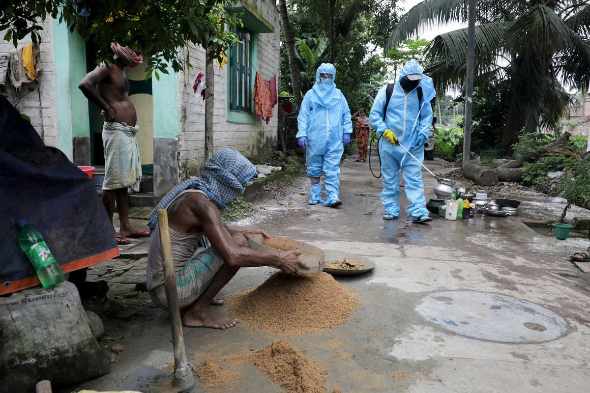 epa08591174 Municipal workers wear personal protective equipment (PPE) as they spray sanitizer at colony homes, a newly added containment zone near Kolkata, eastern India, 08 August 2020. Bengal government announced a complete lockdown for two days in a week. India lists as third most COVID-19 affected country in the world. EPA/PIYAL ADHIKARY