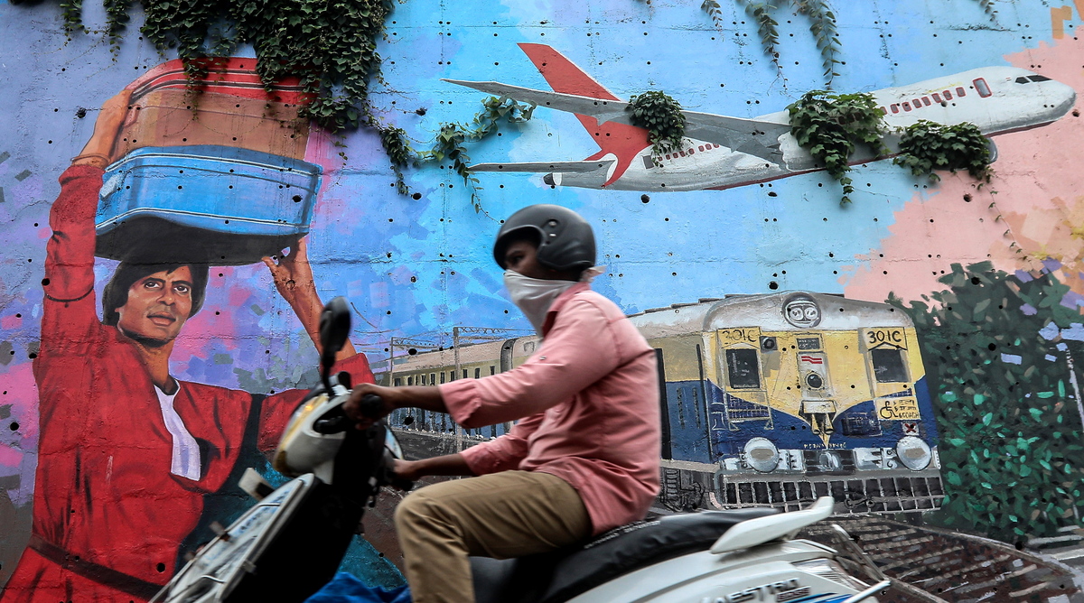 epa08563127 A man wearing a protective face mask drives past a mural of Indian Bollywood actor Amitabh Bachchan in Mumbai, India, 23 July 2020. According to media reports, Bachchan, 77, tested positive for COVID-19 and has been admitted to a hospital in Mumbai on 11 July 2020. His son, daughter-in-law, and their daughter also tested positive for the virus. EPA/DIVYAKANT SOLANKI