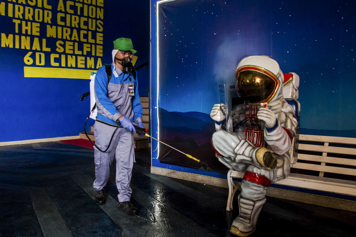 Δημόσιος υπάλληλος απολυμαίνει τους χώρους του θεματικού πάρκου Jatim, στην Ινδονησία. (EPA/FULLY HANDOKO)