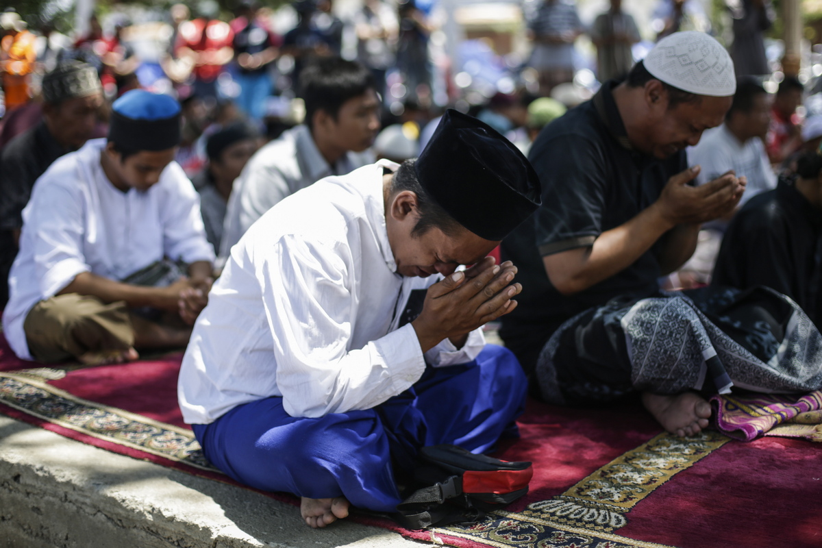epa07070831 Jabal Nur (C), 35, weeps during a Friday prayer at a temporary shelter for the earthquake and tsunami survivors outside the grand mosque in Palu, Central Sulawesi, Indonesia, 05 October 2018. Nur lost his yonger sister when the earthquake damaged his house. According to reports, at least 1,424 people have died after a series of powerful earthquakes hit Central Sulawesi on 28 September 2018, which triggered a tsunami. EPA/MAST IRHAM