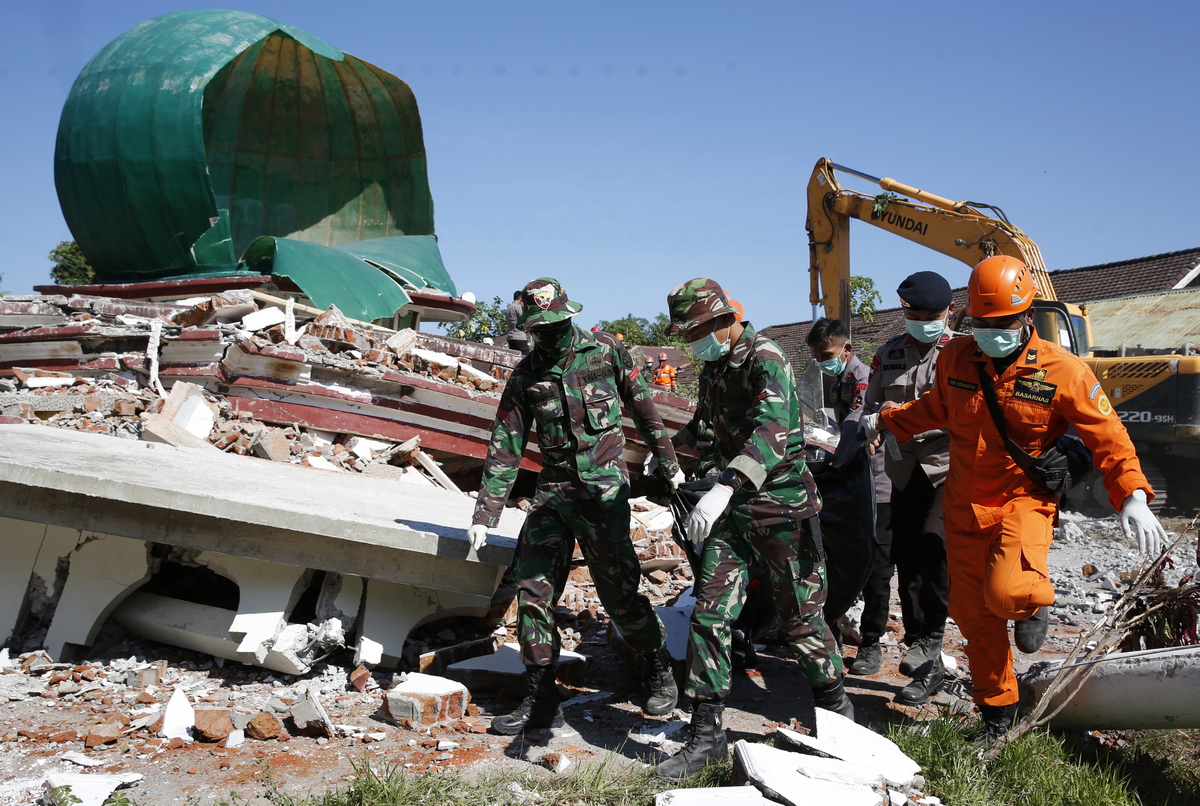 epaselect epa06931701 Indonesian rescuers and soldiers carry a victim in a body bag from a collapsed mosque after an earthquake struck northern Lombok, West Nusa Tenggara, Indonesia, 07 August 2018. According to media reports, a 7.0 magnitude quake hit Indonesia's island of Lombok on 05 August, killing at least 98 people. Several aftershocks have been detected and hundreds of foreign tourists are on an exodus from the Indonesian island. EPA/ADI WEDA