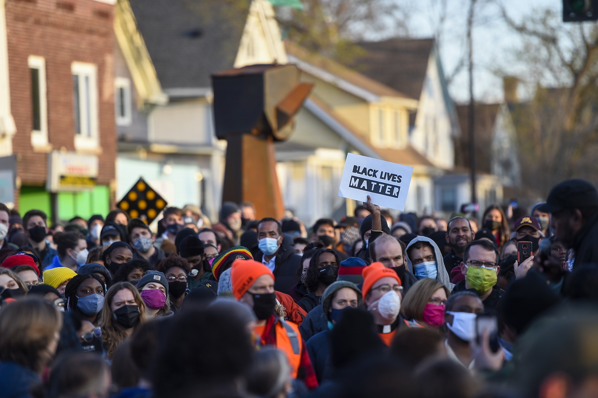 epa09148738 A large crowd gathers at George Floyd Square after former Minneapolis Police Officer Derek Chauvin was found guilty on all counts in the death of George Floyd in Minneapolis, Minnesota, USA, 20 April 2021. Chauvin was found guilty on charges of second-degree murder, third-degree murder and second-degree manslaughter. EPA/CRAIG LASSIG