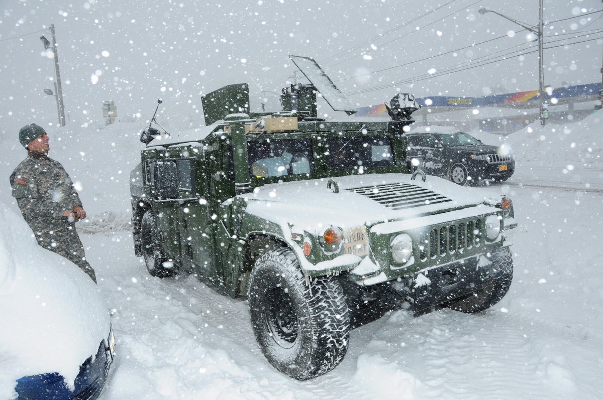 epa04497644 A handout picture provided by the US Department of Defense on 21 November 2014 shows US soldiers assigned to the 105th Military Police Company, New York Army National Guard, providing traffic control during heavy snowfall in West Seneca, New York, USA, 20 November 2014. According to reports, more than 375 National Guard Soldiers assisted local authorities in snow removal efforts and traffic control after regions of western New York experienced over 1.8 meters of snowfall within 72 hours. EPA/RAY LLOYD/NATIONAL GUARD/US DEPARTMENT OF DEFENSE/HANDOUT HANDOUT EDITORIAL USE ONLY