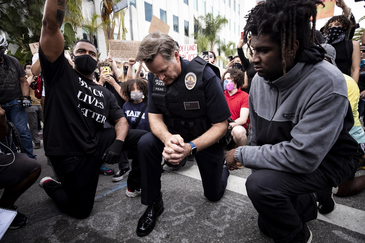 Ο διοικητής της Αστυνομίας του Λος Άντζελες LAPD, Cory Palka (Κ), γονατίζει δίπλα σε διαδηλωτές δίπλα στο σπίτι του δημάρχου του Λος Άντζελες, Eric Garcetti, καθώς χιλιάδες διαδηλωτές βγήκαν στο δρόμο για να διαδηλώσουν μετά το θάνατο του Τζορτζ Φλόιντ, Λος Άντζελες, Καλιφόρνια, ΗΠΑ, στις 2 Ιουνίου 2020. EPA/ETIENNE LAURENT