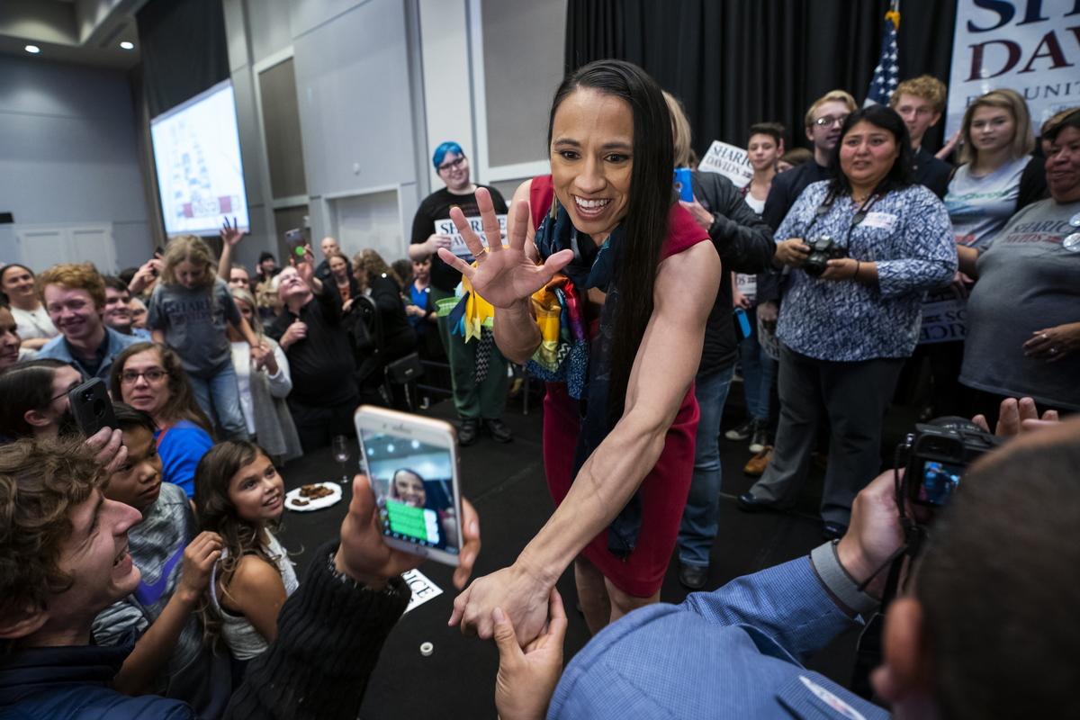 epa07147373 Democratic House candidate from Kansas Sharice Davids celebrates after winning her race at her election night watch party at the Embassy Suites Hotel in Olathe, Kansas, USA, 06 November 2018. Davids is the first lesbian Native American Congresswoman by beating Republican incumbent Kevin Yoder. Davids is one of several first-time female candidates that helped the Democratic Party takeover in the House of Representatives. EPA/JIM LO SCALZO