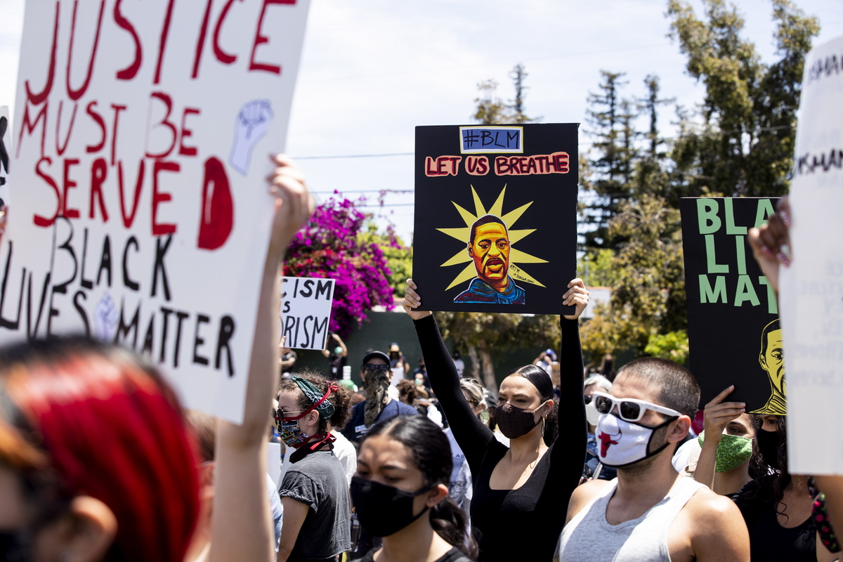 epa08454860 A protester holds a placard reading 'Let Us Breathe' as thousands of protesters gather at the Pan Pacific Park to demonstrate following the death of George Floyd, in Los Angeles, California, USA, 30 May 2020. A bystander's video posted online on 25 May appeared to show George Floyd, 46, pleading with arresting officers that he couldn't breathe as an officer knelt on his neck, in Minnesota. The unarmed black man later died in police custody. Hennepin County Attorney announced murder and manslaughter charges against the Minneapolis police officer who killed George Floyd. EPA/ETIENNE LAURENT