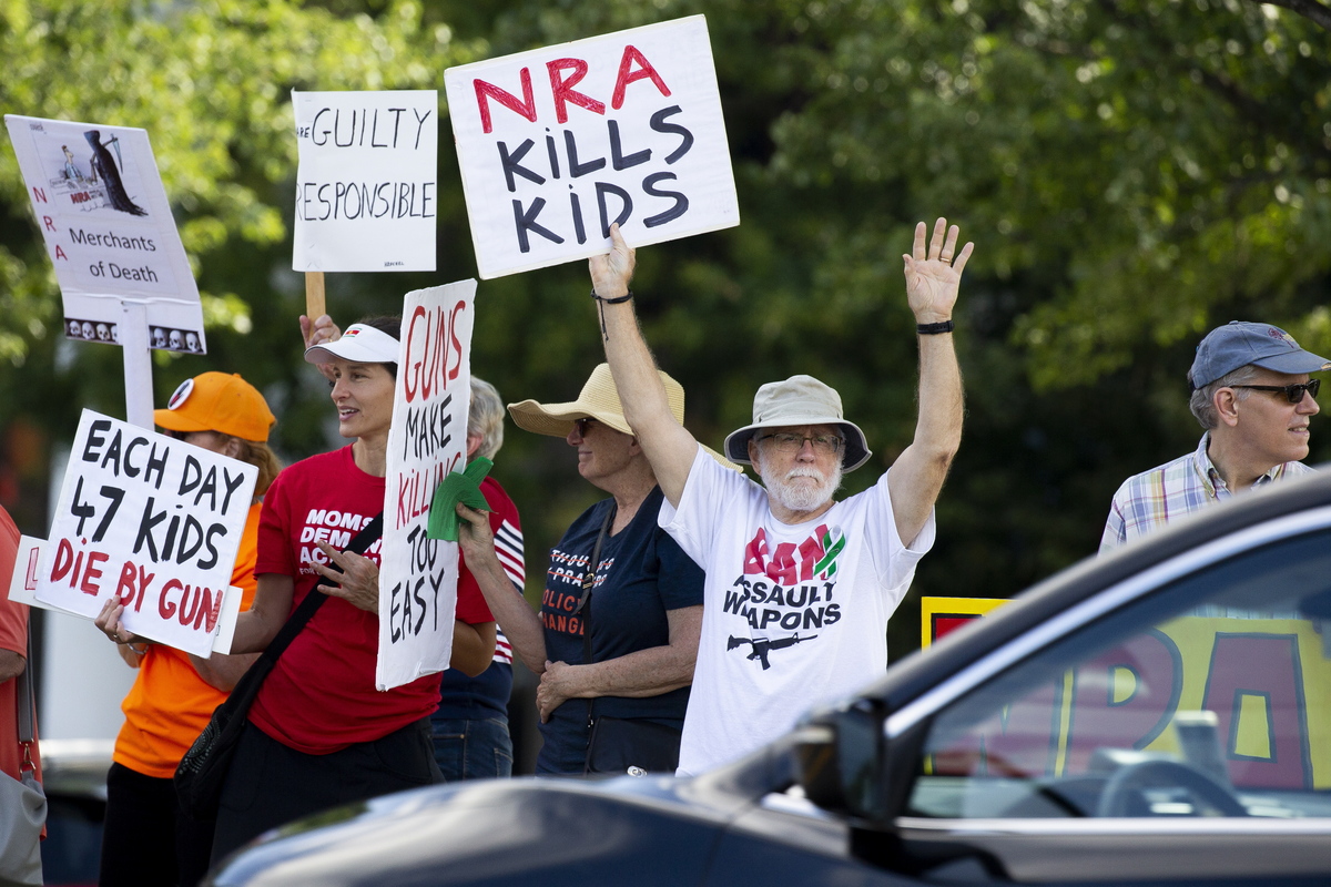 epa07773490 Supporters of gun control reform protest against the National Rifle Association (NRA) at the NRA headquarters in Fairfax, Virginia, USA, 14 August 2019. There has been a renewed call for gun control reform legislation in the United States following the 03 August 2019 mass shooting that killed 22 people in El Paso, Texas; and the mass shooting the following day in Dayon, Ohio, that resulted in ten deaths. EPA/MICHAEL REYNOLDS