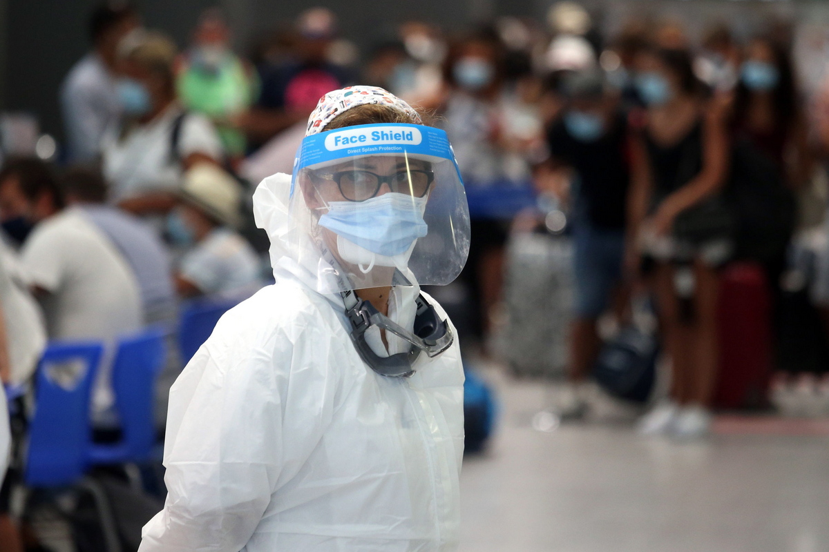 epa08614277 Health workers collect swabs and conduct tests on passengers for coronavirus disease (COVID-19) positivity, at the Malpensa airport in Milan, Italy, 20 August 2020. Countries around the world are taking increased measures to stem the widespread of the SARS-CoV-2 coronavirus which causes the COVID-19 disease. EPA/MATTEO BAZZI