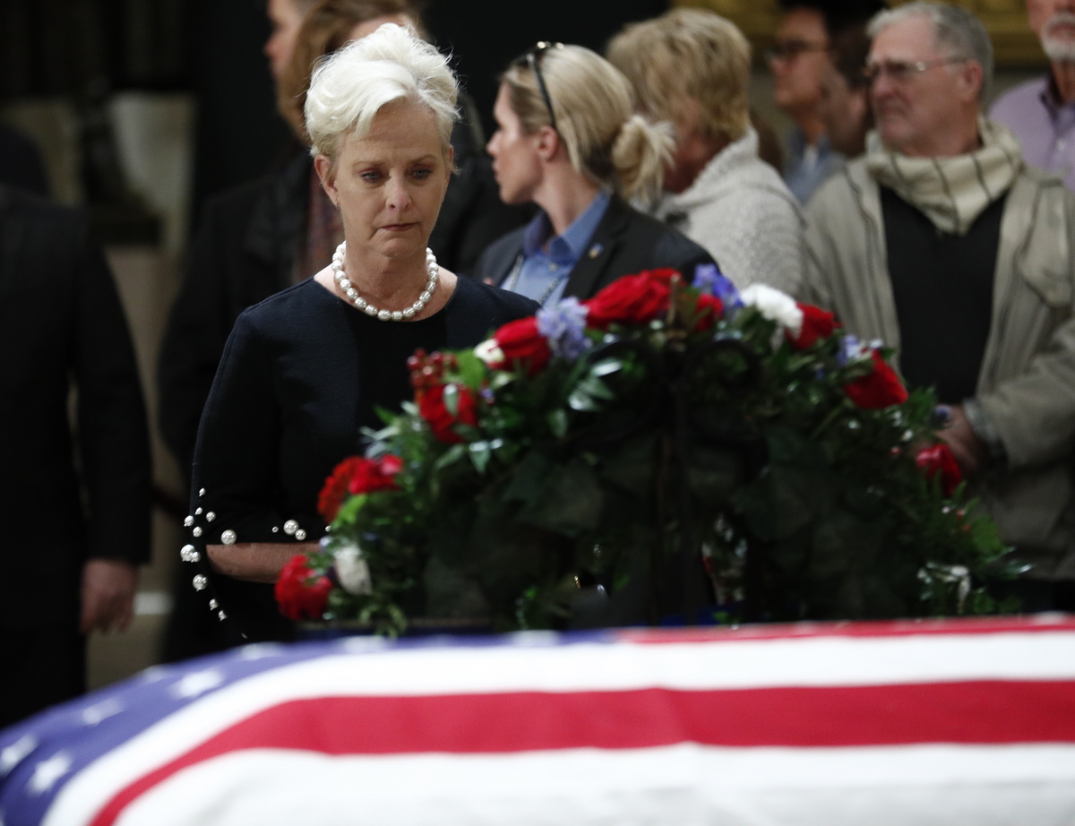 epa07208972 Cindy McCain, widow of the late Sen. John McCain pays her respects to the flag-draped casket containing the body of former US President George H.W. Bush lying in state in the Rotunda of the US Capitol in Washington, DC, USA, 04 December 2018. George H.W. Bush, the 41st President of the United States (1989-1993), died at the age of 94 on 30 November 2018 at his home in Texas. EPA/TING SHEN