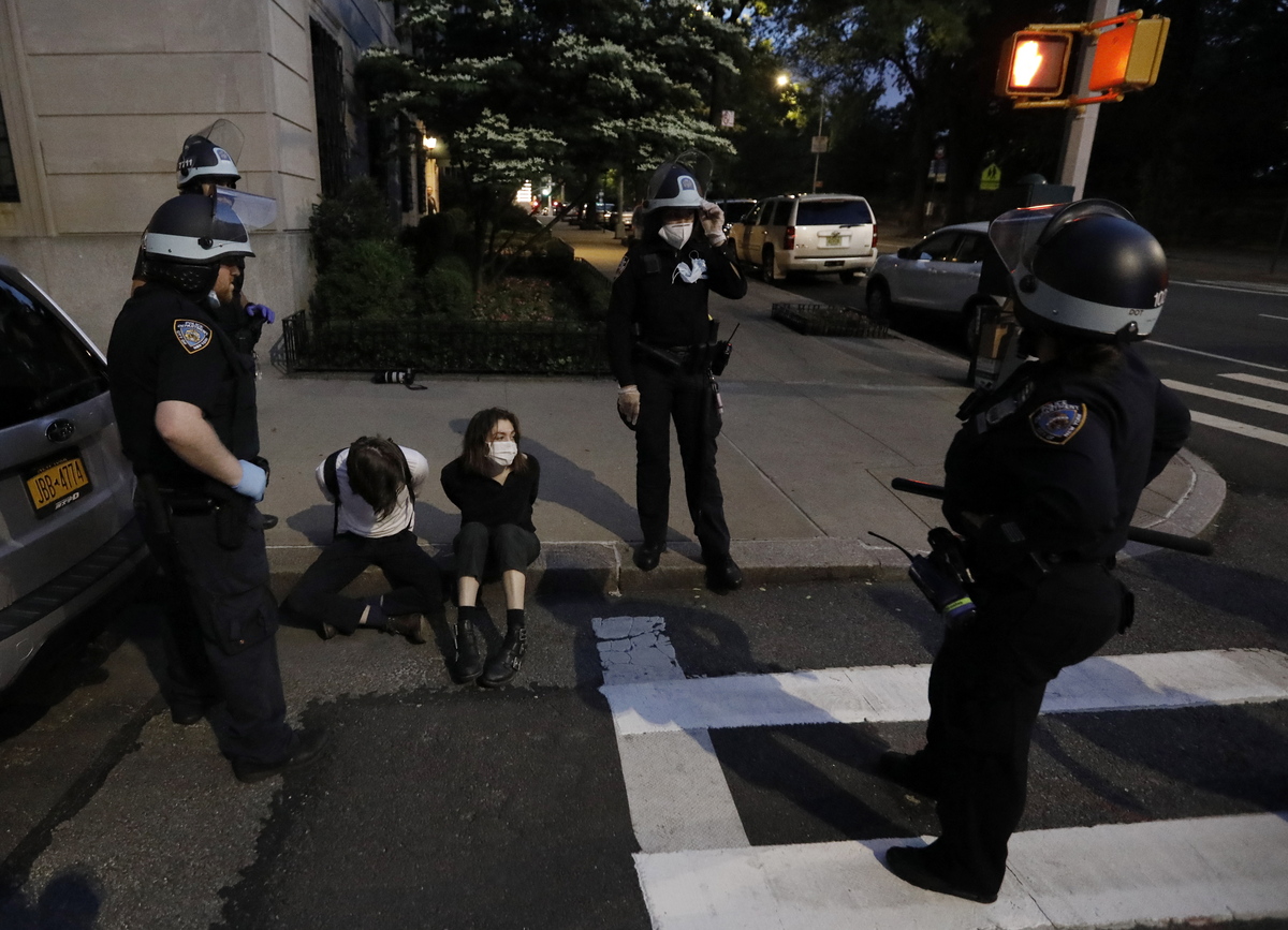 epaselect epa08461854 New York City Police arrest two people for breaking the 8:00 PM curfew during unrest after George Floyd died in police custody, in New York, USA, 02 June 2020. A bystander's video posted online on 25 May, appeared to show George Floyd pleading with arresting officers that he couldn't breathe as an officer knelt on his neck. The unarmed black man later died in police custody. EPA/Peter Foley