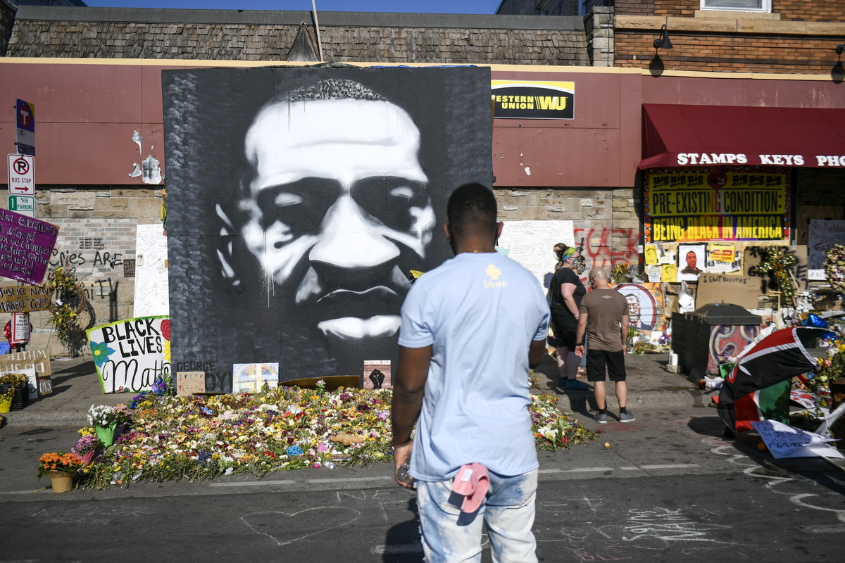 epa08473920 People continue to gather near the intersection of 38th and Chicago where two weeks ago George Floyd was arrested and later died in police custody, in Minneapolis, Minnesota, USA, 08 June 2020. A bystander's video posted online on 25 May, appeared to show George Floyd, 46, pleading with arresting officers that he couldn't breathe as an officer knelt on his neck. The unarmed black man later died in police custody. EPA/CRAIG LASSIG