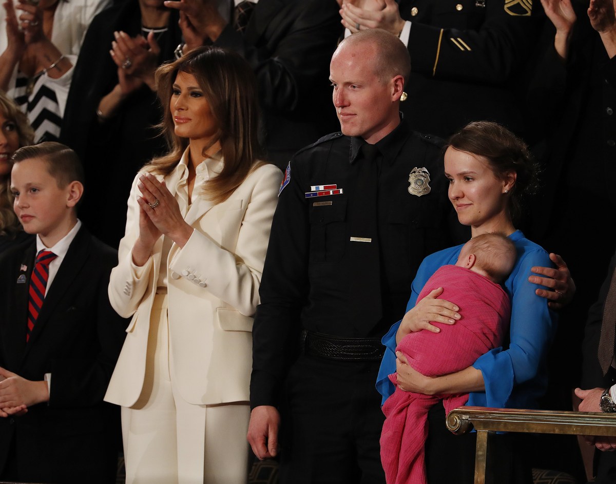 Τα χαμόγελα της πρώτης κυρίας των ΗΠΑ μπορούσαν να μετρηθούν στα δάκτυλα του ενός χεριού χθες. Το πρώτο, το πιο εντυπωσιακό, μόλις εμφανίστηκε στη Βουλή των Αντιπροσώπων όταν τη χειροκρότησαν όλοι οι παρευρισκόμενοι. Στη συνέχεια συνομίλησε χαλαρά με τον 12χρονο γιο της Μπάρον που καθόταν δεξιά της και τον σερίφη της Αλμπουκέρκης Τζο Αρπάγιο στα αριστερά της.