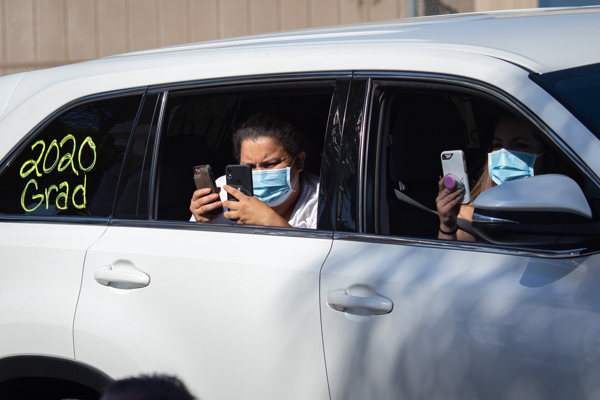 epa08557583 Family members of a graduate take pictures while wearing masks at a graduation ceremony at the California High School amid the coronavirus pandemic in Whittier, California, USA, 20 July 2020. Friends and family members were required to stay in their cars as the students were handed their diplomas by school staff who were social distancing and wearing masks, due to the coronavirus pandemic. EPA/CHRISTIAN MONTERROSA