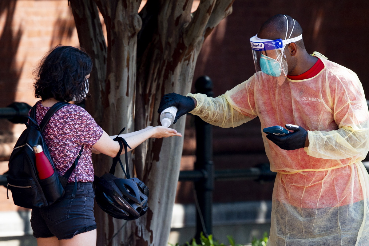 epa08596264 A person preparing to be tested washes her hands at a walk-up COVID-19 testing site operated by Medical Reserve Corps volunteers, nurses and District of Columbia Department of Health officials, in Washington, DC, USA, 10 August 2020. EPA/MICHAEL REYNOLDS