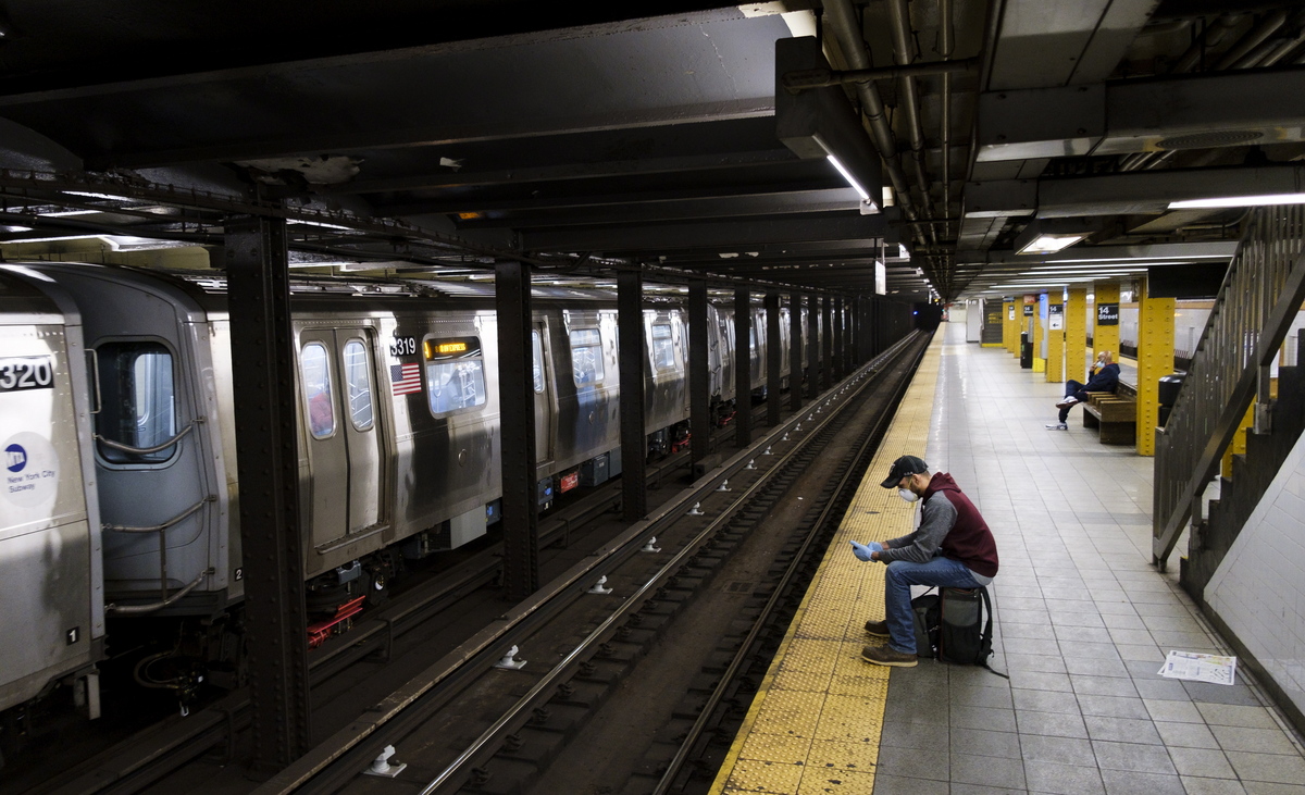epa08401072 A man sits on his backpack on a subway platform as ridership in the country's largest transit system is down by 90 percent in New York City, New York, USA, 04 May 2020. NYC, which is still considered the epicenter of the coronavirus outbreak in the United States, will begin the unusual measure of shutting down the subway network overnight for disinfection as the city tries to handle the large number of homeless people sleeping in the stations and trains. EPA/JUSTIN LANE