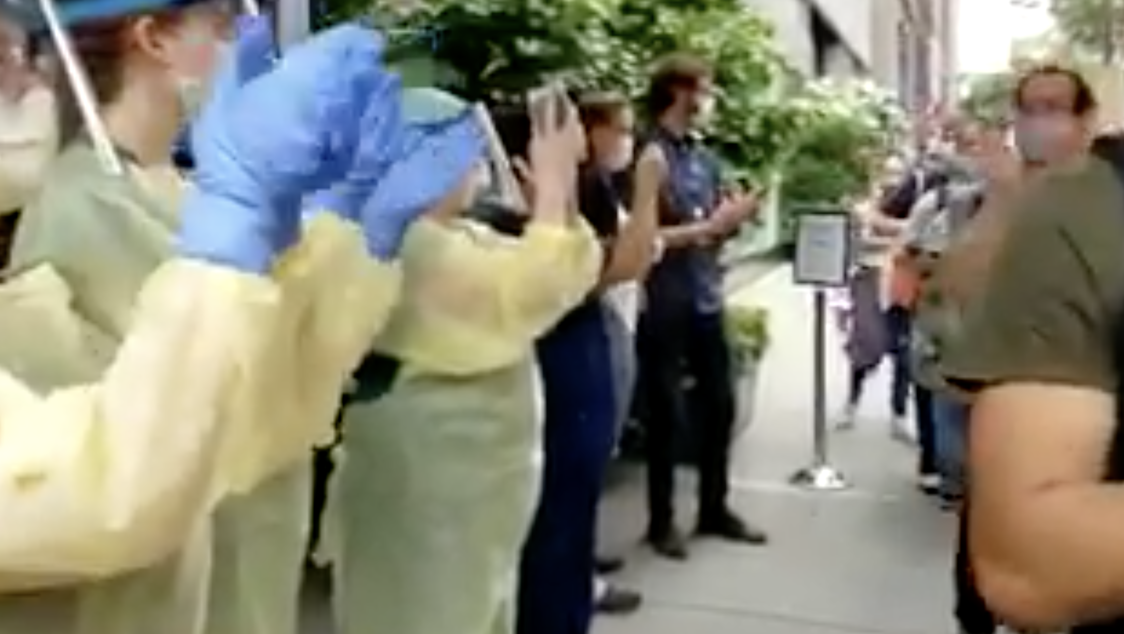 Την Πέμπτη, εκατοντάδες μέλη του ιατρονοσηλευτικού προσωπικού βγήκαν στους δρόμους της Νέας Υόρκης φορώντας τις στολές τους, συχνά και μάσκες προστασίας, έξω από τα νοσοκομεία όπου εργάζονται για να εκφράσουν την υποστηριξή τους στους διαδηλωτές που βρίσκονται εδώ και περισσότερες από δέκα ημέρες στον δρόμο.