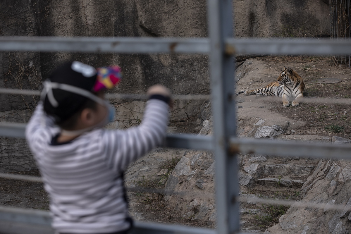 epa08320641 A boy wearing protective face mask looks at a Siberian tiger at Beijing Zoo in Beijing, China, 25 March 2020. The zoo reopened its outdoor exhibit areas to the public after closed due to the coronavirus outbreak. EPA/WU HONG