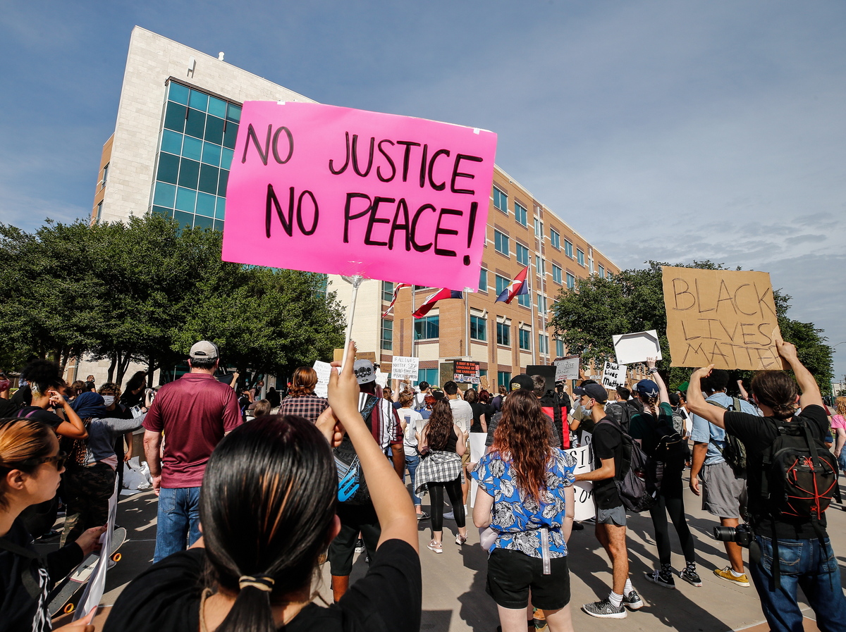 epa08459142 People demonstrate during a protest against the Minnesota arrest of George Floyd, who later died in police custody, in Dallas, Texas, USA, 01 June 2020. A bystander's video posted online on 25 May, appeared to show George Floyd, 46, pleading with arresting officers that he couldn't breathe as an officer knelt on his neck. The unarmed Black man later died in police custody. According to news reports on 29 May, Derek Chauvin, the police officer in the center of the incident has been taken into costody and charged with murder in the George Floyd killing. EPA/LARRY W. SMITH