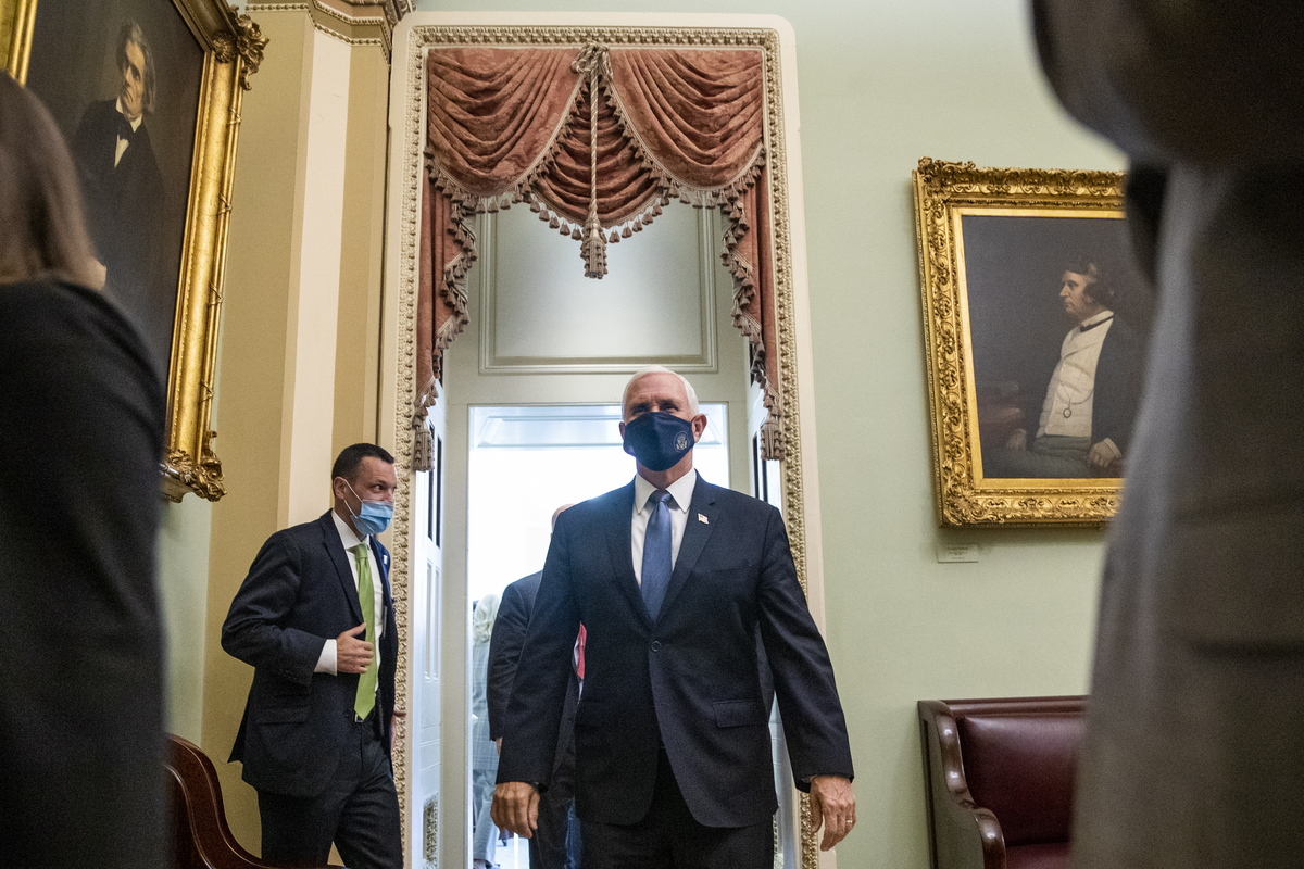 epa08706103 Following a meeting Vice President Mike Pence departs the US Capitol in Washington, DC, USA, 29 September 2020. Supreme Court Nominee Judge Amy Coney Barrett will meet individually with Senators this week prior to her confirmation hearings that are scheduled to start 12 October. EPA/SHAWN THEW