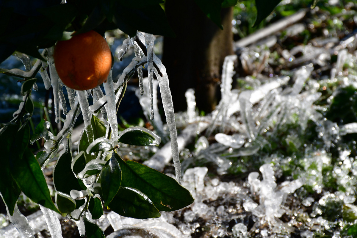 Παγοκρύσταλλοι σε δέντρο πορτοκαλιάς από τη μεγάλη και με διάρκεια πτώση της θερμοκρασίας στον Αργολικό κάμπο τη νύχτα και τα ξημερώματα της Τετάρτης 17 Φεβρουαρίου 2021. Η πτώση του υδραργύρου ξεκίνησε από νωρίς το βράδυ και έφτασε στους -5 βαθμούς Κελσίου και διατηρήθηκε μέχρι το πρωί, σύμφωνα με τις θερμοκρασίες που κατέγραψε ο σταθμός της ΕΜΥ. Οι ανεμομείκτες της αντιπαγετικής προστασίας δούλευαν στο φουλ όλη την νύχτα, ενώ η τεχνητή βροχή που χρησιμοποιούν οι αγρότες για την προστασία των δέντρων δημιούργησε τους γνωστούς κρυστάλλους με το νερό να παγώνει κάτω από τα δέντρα,. Αυτό που αντικρίζει κανείς το πρωί της Τετάρτης στον Αργολικό κάμπο είναι σκηνικό κατάψυξης με τα πάντα να έχουν παγώσει, ενώ έντονη είναι η ανησυχία των αγροτών από τις ζημιές που έχει προκαλέσει ο ισχυρός παγετός. ΑΠΕ-ΜΠΕ/ΑΠΕ-ΜΠΕ/ΜΠΟΥΓΙΩΤΗΣ ΕΥΑΓΓΕΛΟΣ