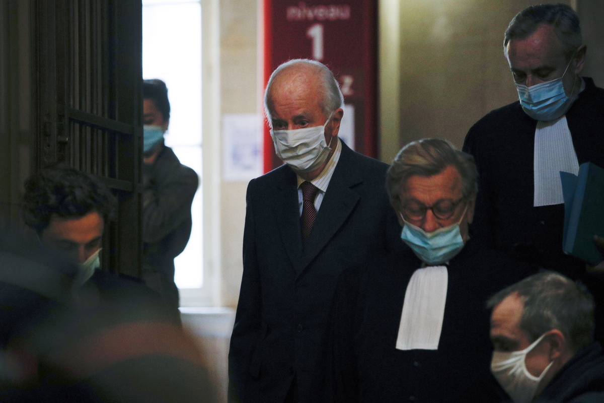 epa08948451 Former French prime minister Edouard Balladur (C-L) arrives for his trial over alleged campaign graft in the so-called 'Karachi affair' at the Court of Justice of the Republic in Paris, France, 19 January 2021. Balladur, 91, is pursued for alleged financial wrongdoing to fund his presidential bid in the nineties. EPA/YOAN VALAT