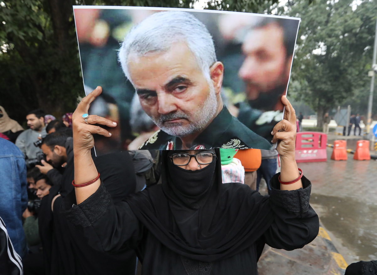 epa08109684 Indian Muslims hold the photographs Iranian General Qasem Soleimani during a protest against America in New Delhi, India, 07 January 2020. Iranian General Qasem Soleimani, the head of Iran's Islamic Revolutionary Guard Corps' elite Quds Force, and Iran-allied Iraqi militia leader Abu Mahdi al-Muhandis were killed in a US airstrike on 03 January in the Iraqi capital Baghdad. EPA/RAJAT GUPTA