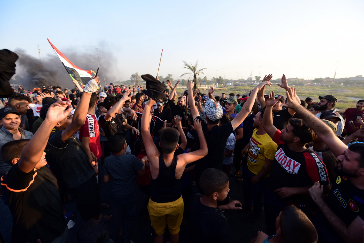 epa07892806 Iraqis protest in east Baghdad, Iraq, 03 October 2019. According to local media reports at least 27 people have died since protests erupted two days earlier. Despite an unlimited curfew that was declared in Baghdad on 03 October from 5 am, the protesters went out again and shouted slogans against the government demanding better services and jobs. EPA/MURTAJA LATEEF