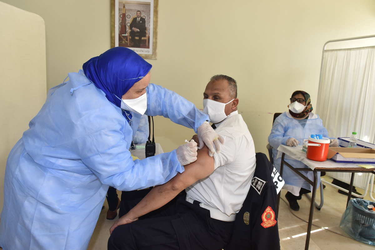 epa08973623 A nurse vaccinates a Police officer against the Covid-19 coronavirus in Sale, Morocco, 29 January 2021. On January 28, Morocco began a vaccination campaign against Covid-19, as King Mohammed VI received the first dose after receiving shipments of the AstraZeneca-Oxford and China Sinopharm vaccines. The vaccination campaign in the first phase is expected to target health care workers and elderly people over the age of 75. EPA/JALAL MORCHIDI