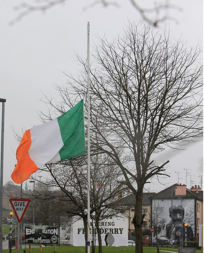 epa05861626 An Republic of Ireland flag flying at half mast in the centre of the Bogside area of Derry, Northern Ireland, 21 March 2017. Sinn Fein's Martin McGuinness, Northern Ireland's former deputy first minister, has died aged 66. It is understood he had been suffering from a rare heart condition. The former IRA leader turned peacemaker worked at the heart of the power-sharing government following the 1998 Good Friday Agreement. He became deputy first minister in 2007, standing alongside Democratic Unionist Party leaders Ian Paisley, Peter Robinson and Arlene Foster. EPA/PAUL MCERLANE