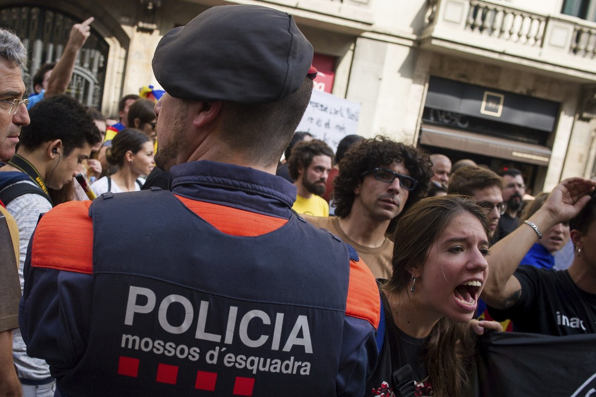 epa06242201 A policeman watches as students demonstrate downtown Barcelona, northeastern Spain, 03 October 2017, to protest against the police actions during the illegal referendum held 01 october 2017. Unions CGT, IAC, COS and CSC called for a general strike in Catalonia as a protest against the Spanish Government measures to avoid the celebration of the referendum last 01 October 2017. According to unions, the strike is having a big support in sectors such as transport, retails, stowage and agriculture. EPA/ENRIC FONTCUBERTA