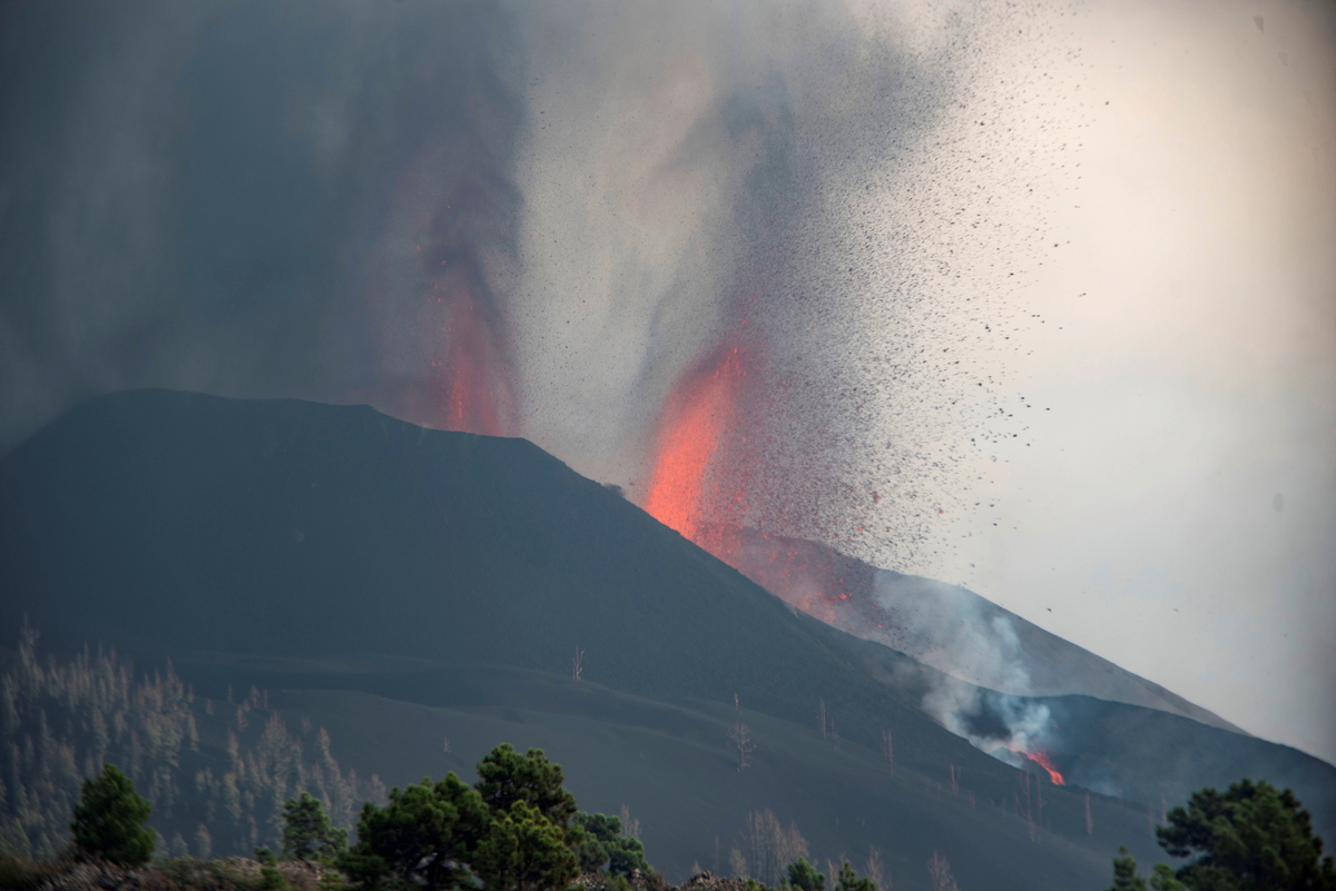 epa09488255 View of a new eruption of Cumbre Vieja Volcano in La Palma island, Canary Islands, southwestern Spain, 25 September 2021. Residents from the three most threaten areas had to be evacuated after the volcano registered more explosivity and two new vents. EPA/Miguel Calero