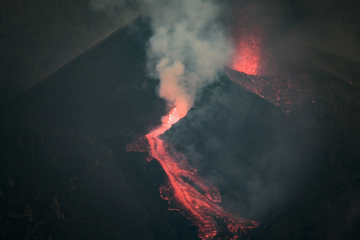 epa09492037 View of the eruption of Cumbre Vieja Volcano in La Palma island, Canary Islands, Spain, 27 September 2021. The Cumbre Vieja volcano began to erupt in the Montana Rajada mountains in the municipality of El Paso on 19 September. The area had registered hundreds of small earthquakes along the week as magma pressed the subsoil on its way out, urging the regional authorities to evacuate locals before the eruption took place. EPA/Angel Medina G
