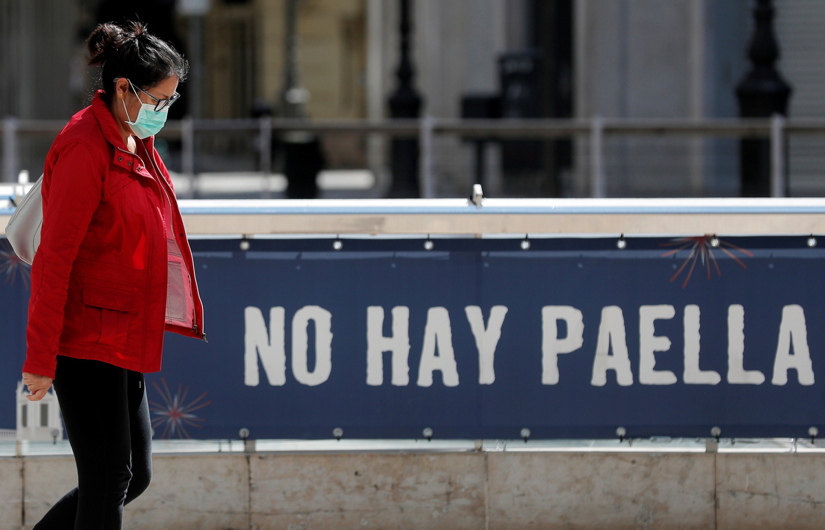 epa08336989 A woman walks near a sign reading in Spanish 'There is no paella' in Valencia, eastern Spain, 01 April 2020. Countries around the world are taking increased measures to stem the widespread of the SARS-CoV-2 coronavirus which causes the COVID-19 disease. EPA/Kai Forsterling