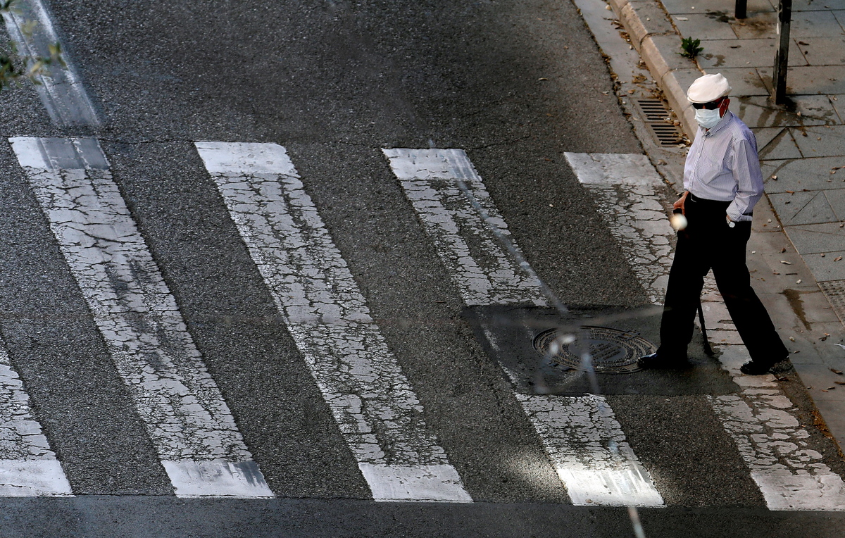 epa08398471 An old man wearing a protective face mask crosses a road as he goes out for a walk in Valencia, eastern Spain, 3 May 2020. Spain began a de-escalation phase amid coronavirus outbreak allowing adults go out home daily with restrictions. Old people can go out from 10 am to 12 pm and 7 pm to 8 pm. Spain is under a lockdown to avoid the spreading of pandemic of the COVID-19 disease caused by the SARS-CoV-2 coronavirus. EPA/Juan Carlos Cardenas