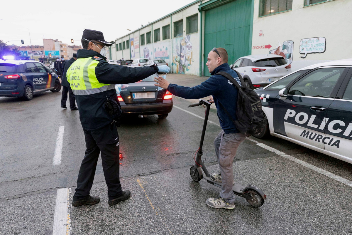 epa08359997 Civil Guards hand in masks to drivers in Murcia, Spain, as many return back to work, 13 April 2020. Many people from various sectors return back to work as lockdown in Spain faces its fifth week in a bid to slow down the spread of the pandemic COVID-19 disease caused by the SARS-CoV-2. EPA/Marcial Guillen